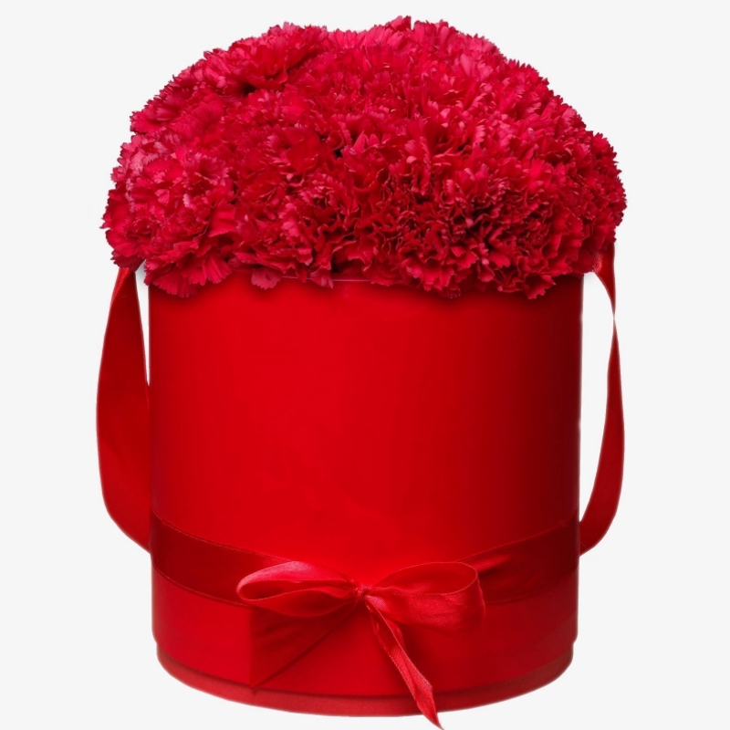 Букет состоит из 25 красных гвоздик, коробка, оазис, атласная лента.