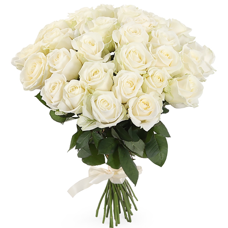 Букет состоит из 35 белых роз, прозрачная упаковка, атласная лента.